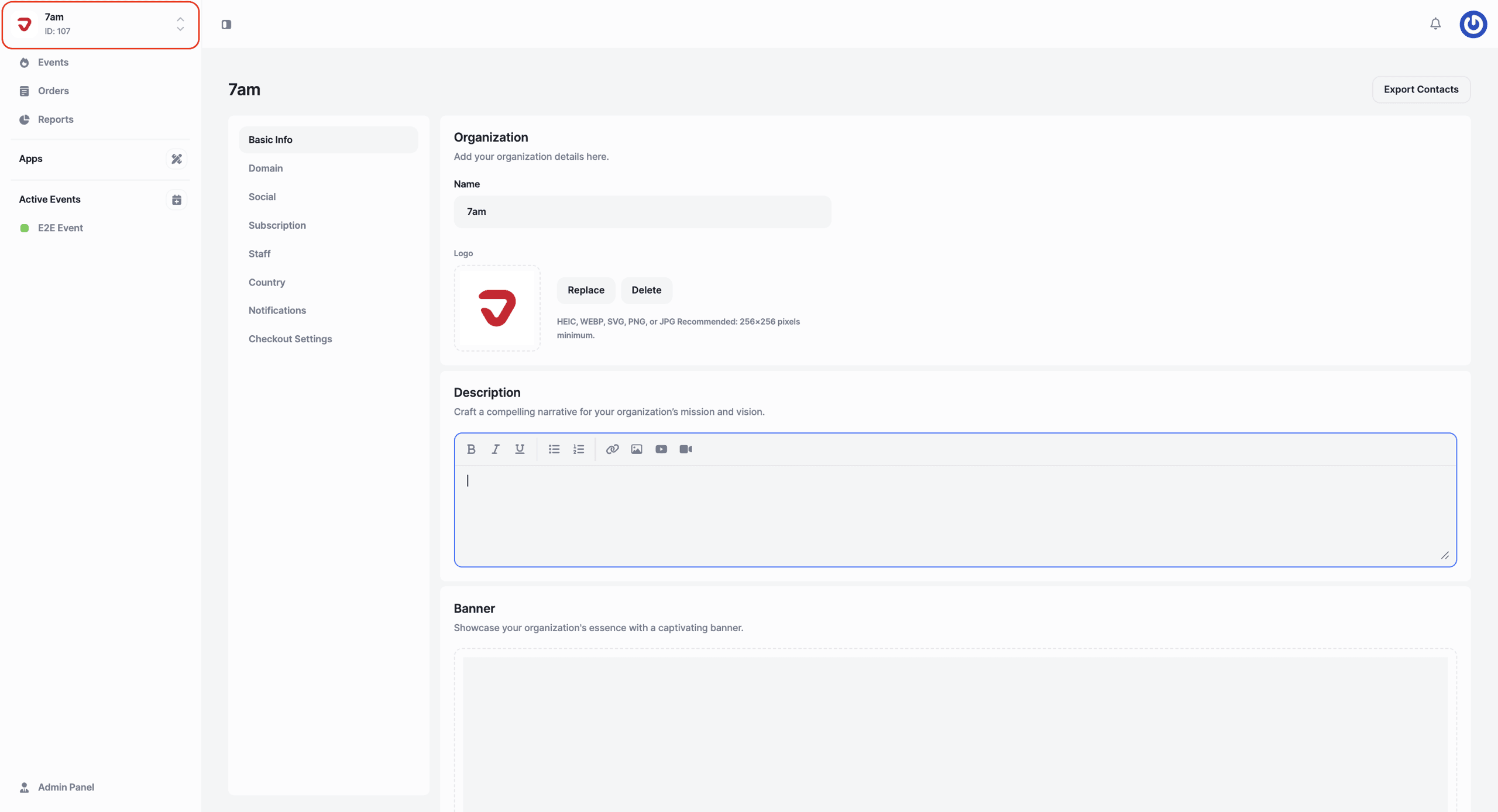 In the top-right corner of the Organizer Panel, select your organization. If you manage more than one, just click the dropdown to switch. All your available organizations will appear in the list.
