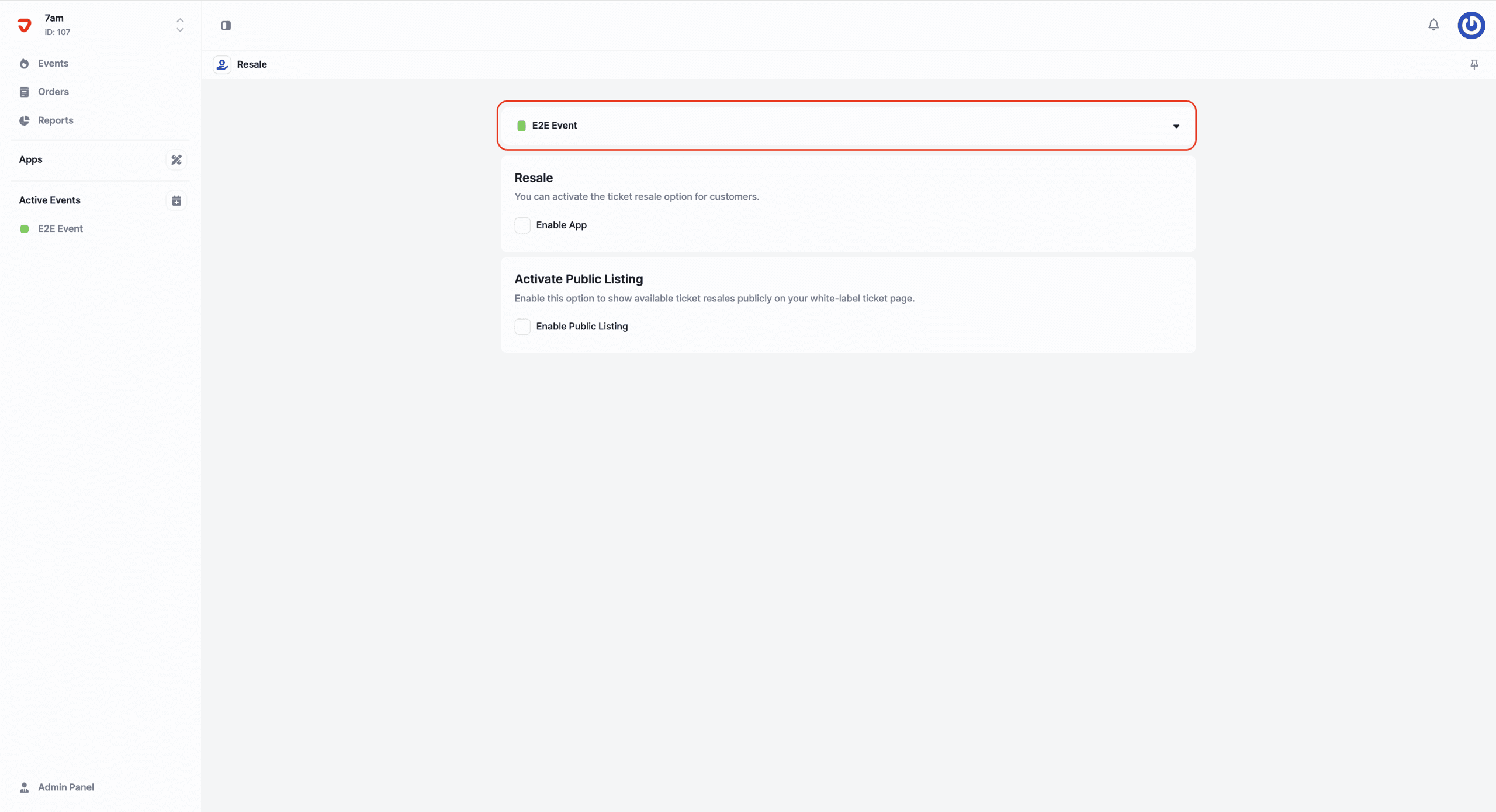 'Enable App' allows reselling within the 7am platform, while ‘Enable Public Listing’ makes those resales visible on your public ticketing page. You can choose to enable one or both, depending on how you want to manage resales.