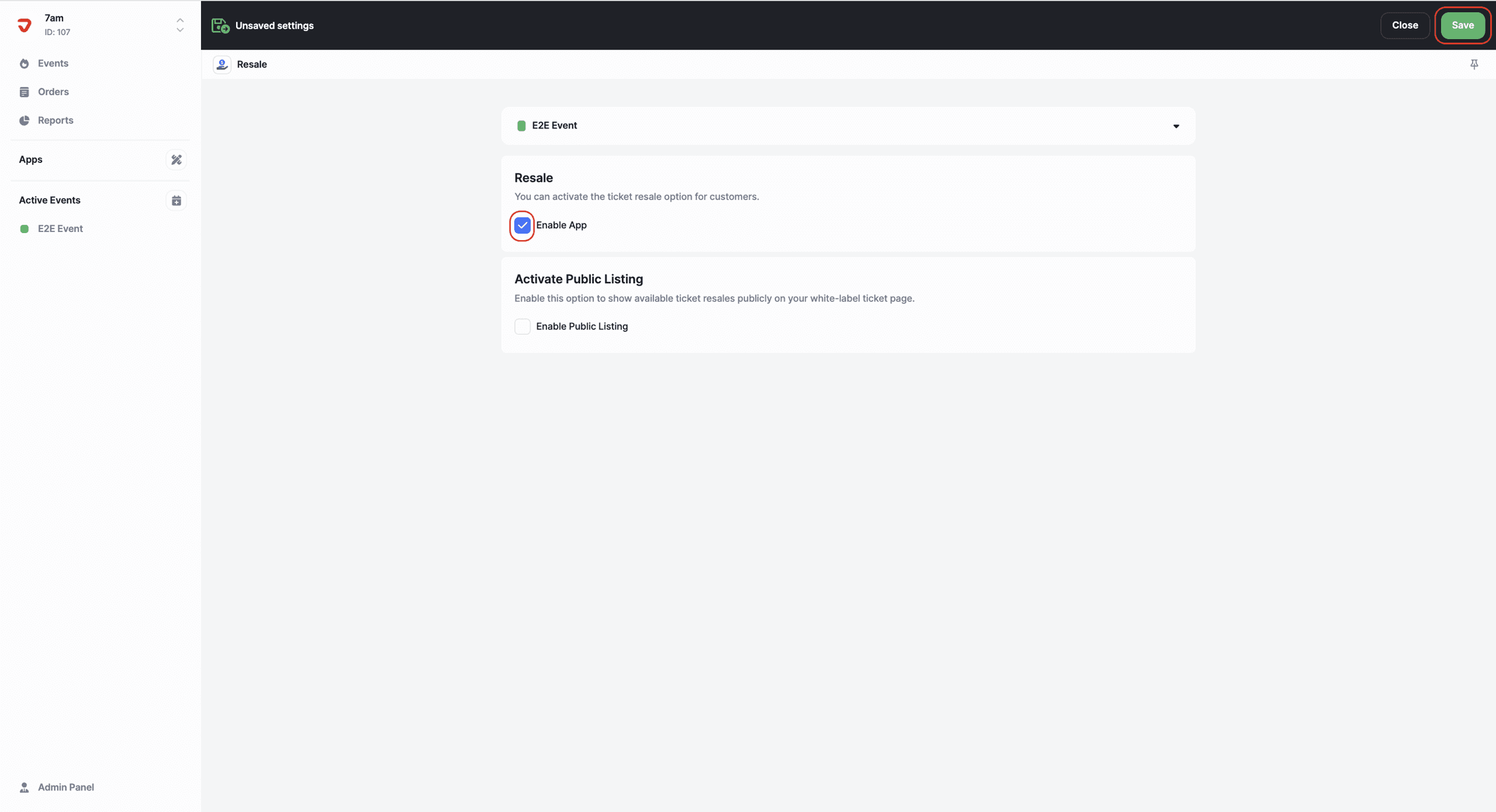Check the box next to ‘Enable App’ to turn on the Resell feature for your selected event. Once enabled, click ‘Save’ in the top-right corner to apply the changes.