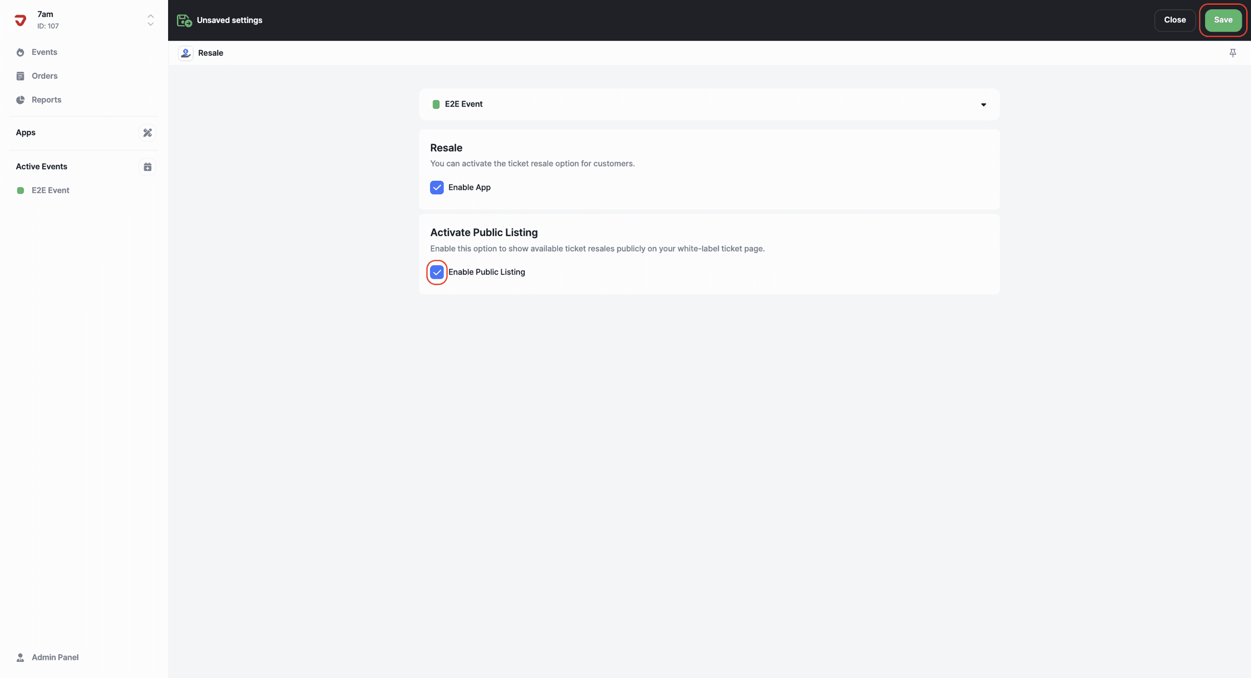 If you’d like ticket resales to be visible on your public ticketing page, check the box next to ‘Enable Public Listing’. After selecting this option, click ‘Save’ in the top-right corner to confirm the changes.