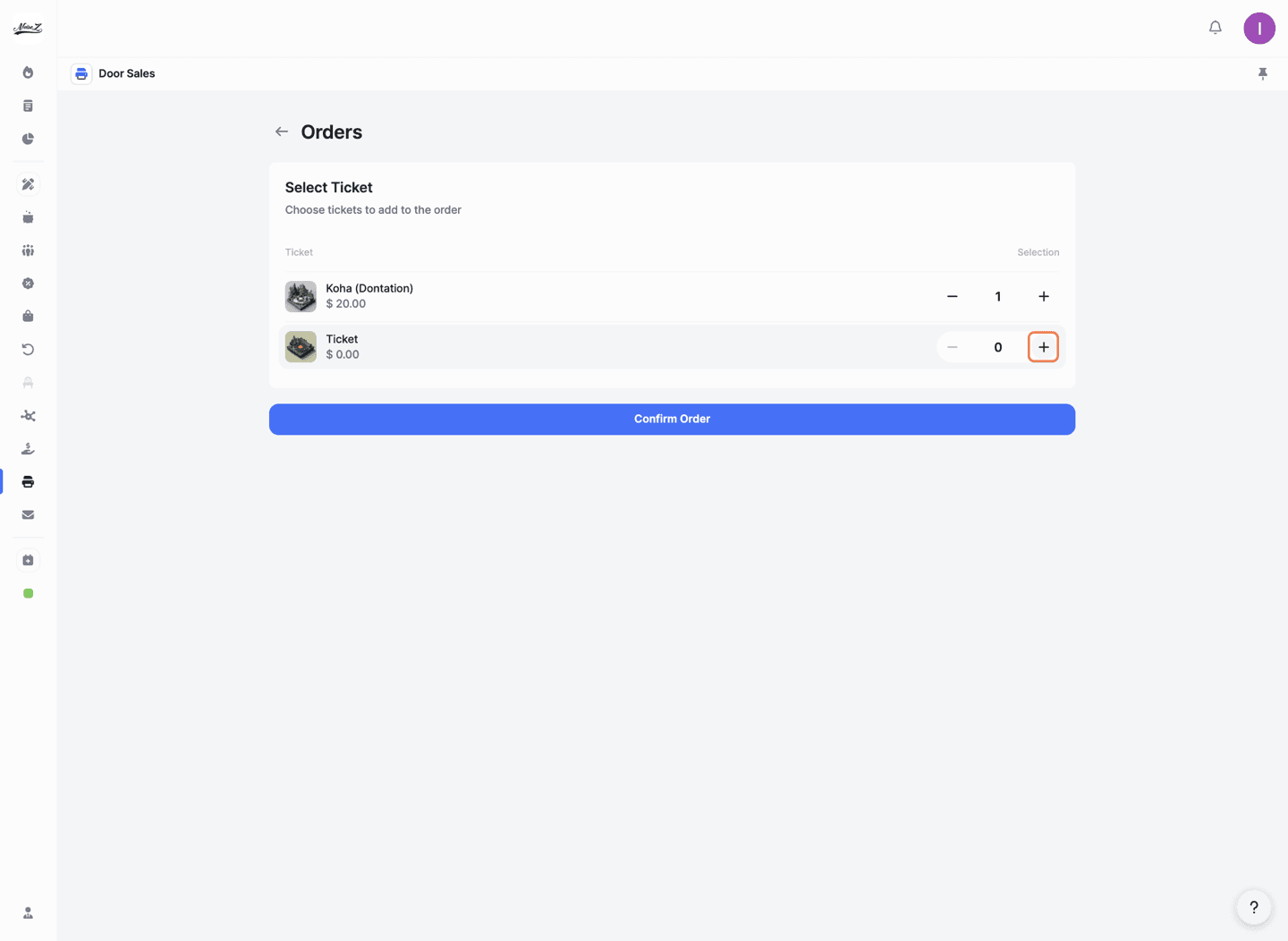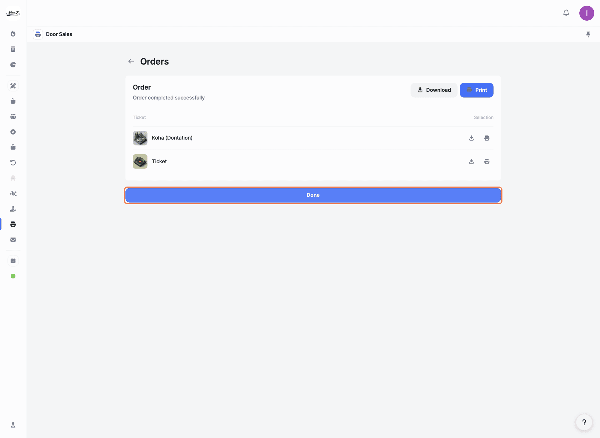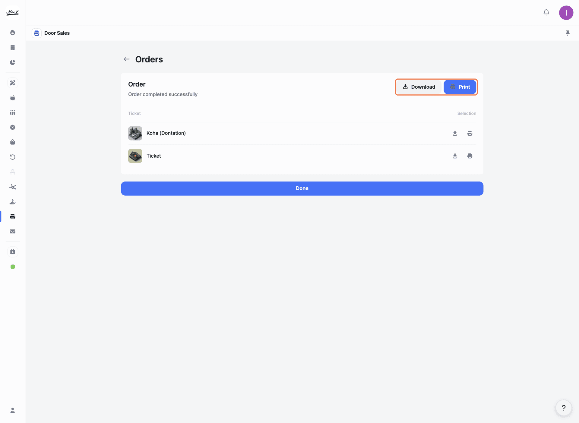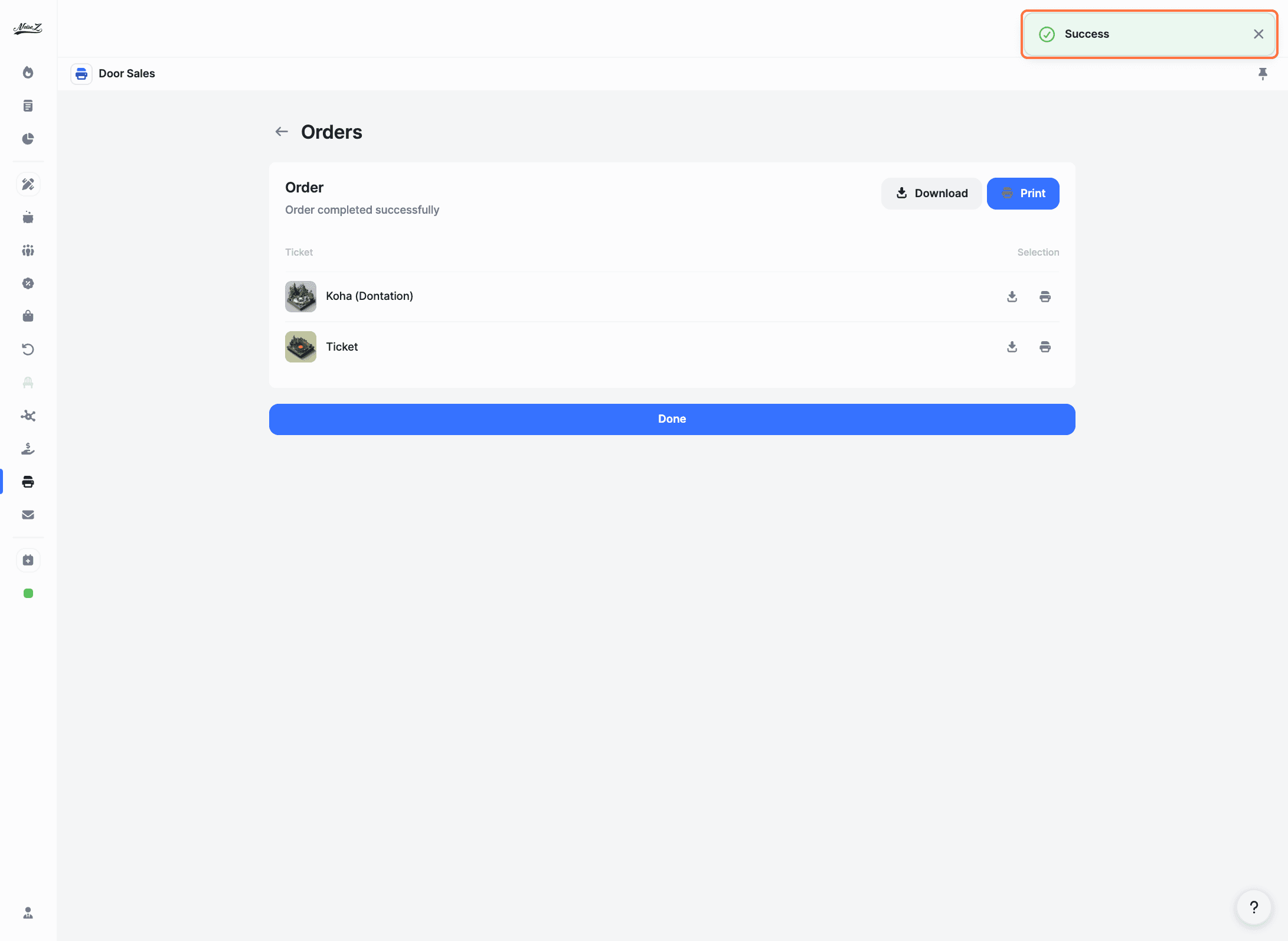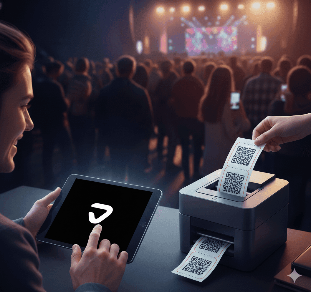 Handle ticket sales directly at your venue on event day. Create orders on the spot, print tickets instantly, or download them as PDFs with scannable QR codes.