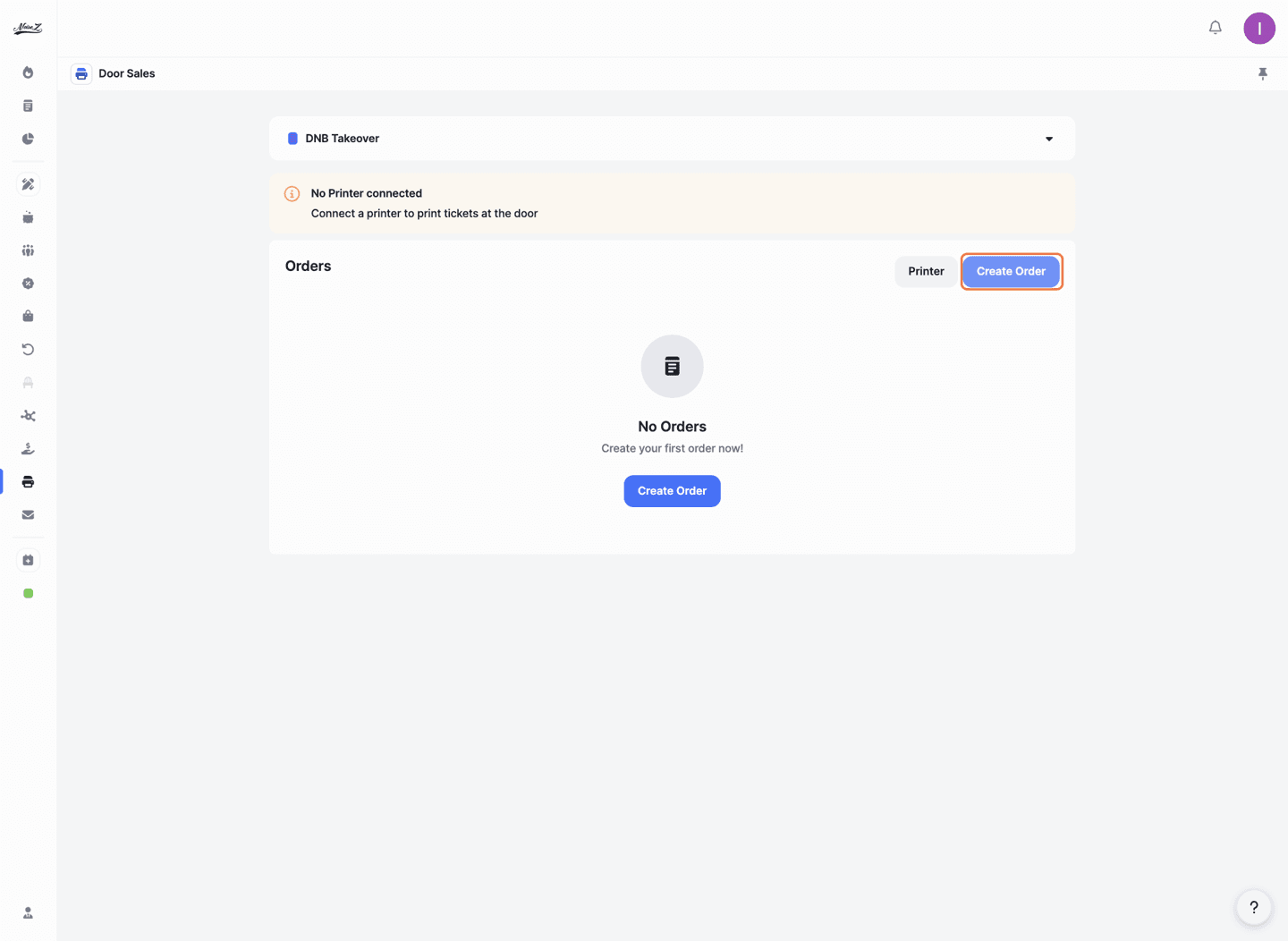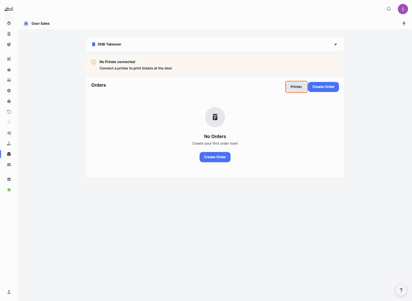 You'll see the main screen with two options: 'Printer' and 'Create Order'.