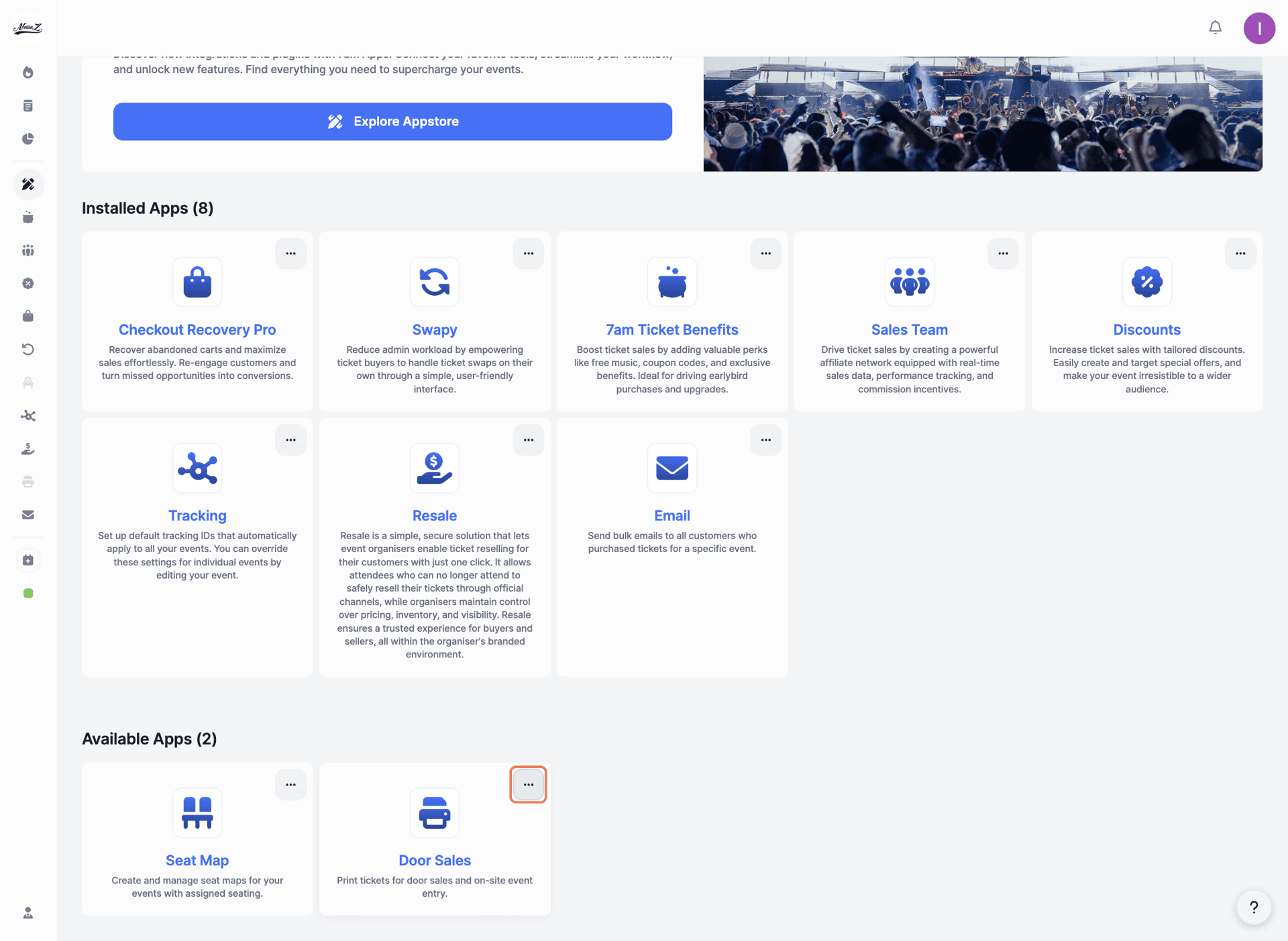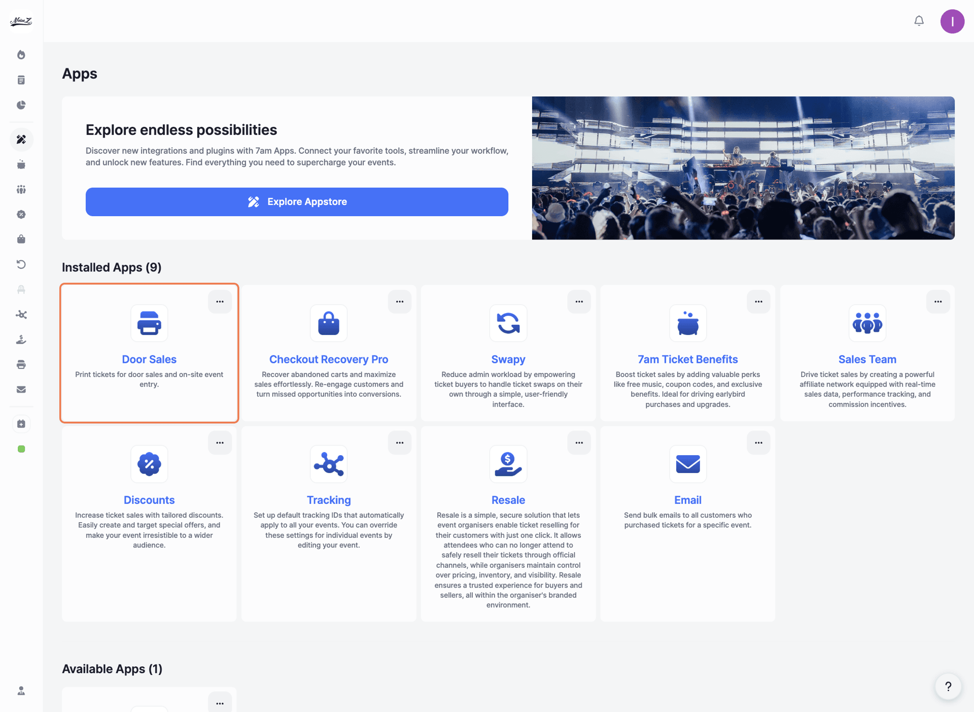 Under 'Available Apps', find 'Door Sales'. Click the three dots in the top-right corner of the app card.
