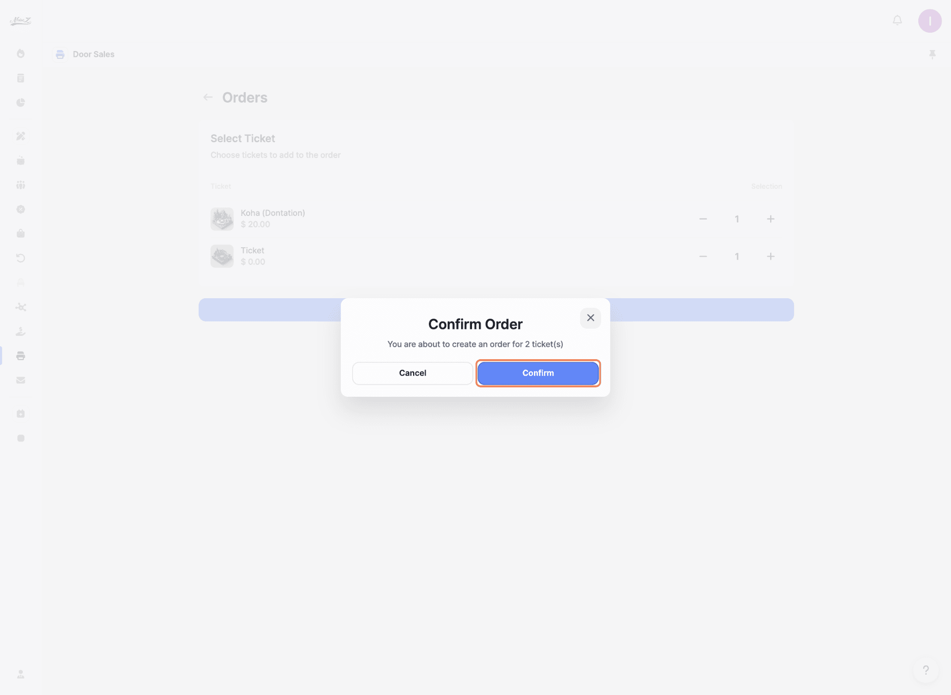 A confirmation window will appear showing the total number of tickets. Click 'Confirm' to complete the order.