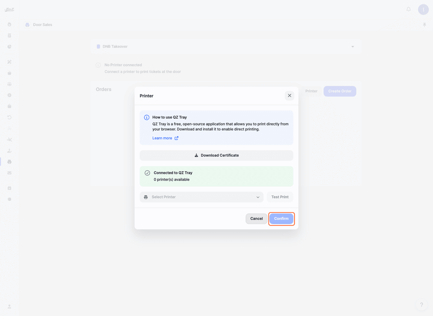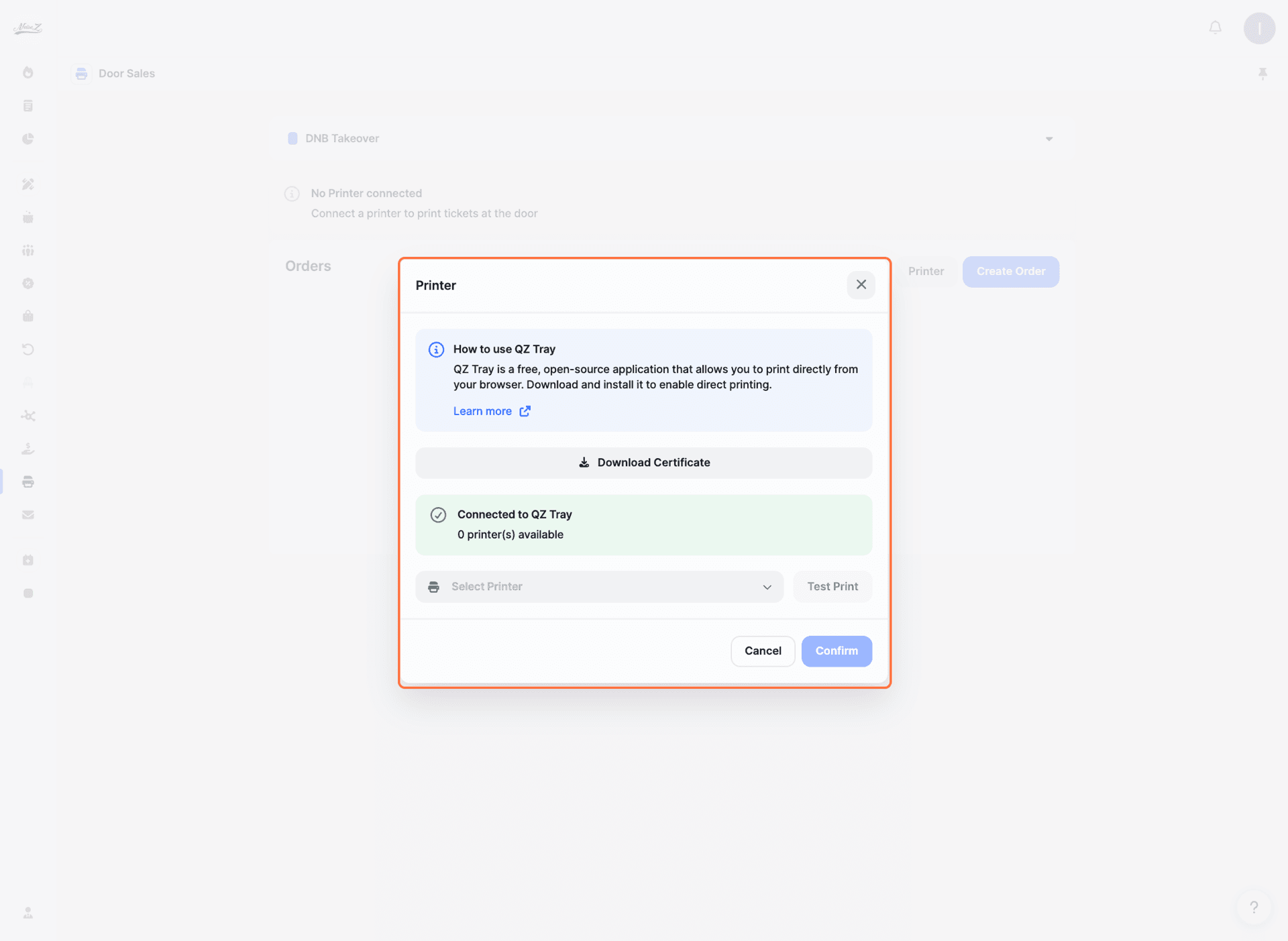 A window will open where you can download and install QZ Tray (click 'Learn more' for detailed instructions), download the certificate, select your printer from the list, and run a test print to make sure everything is working.