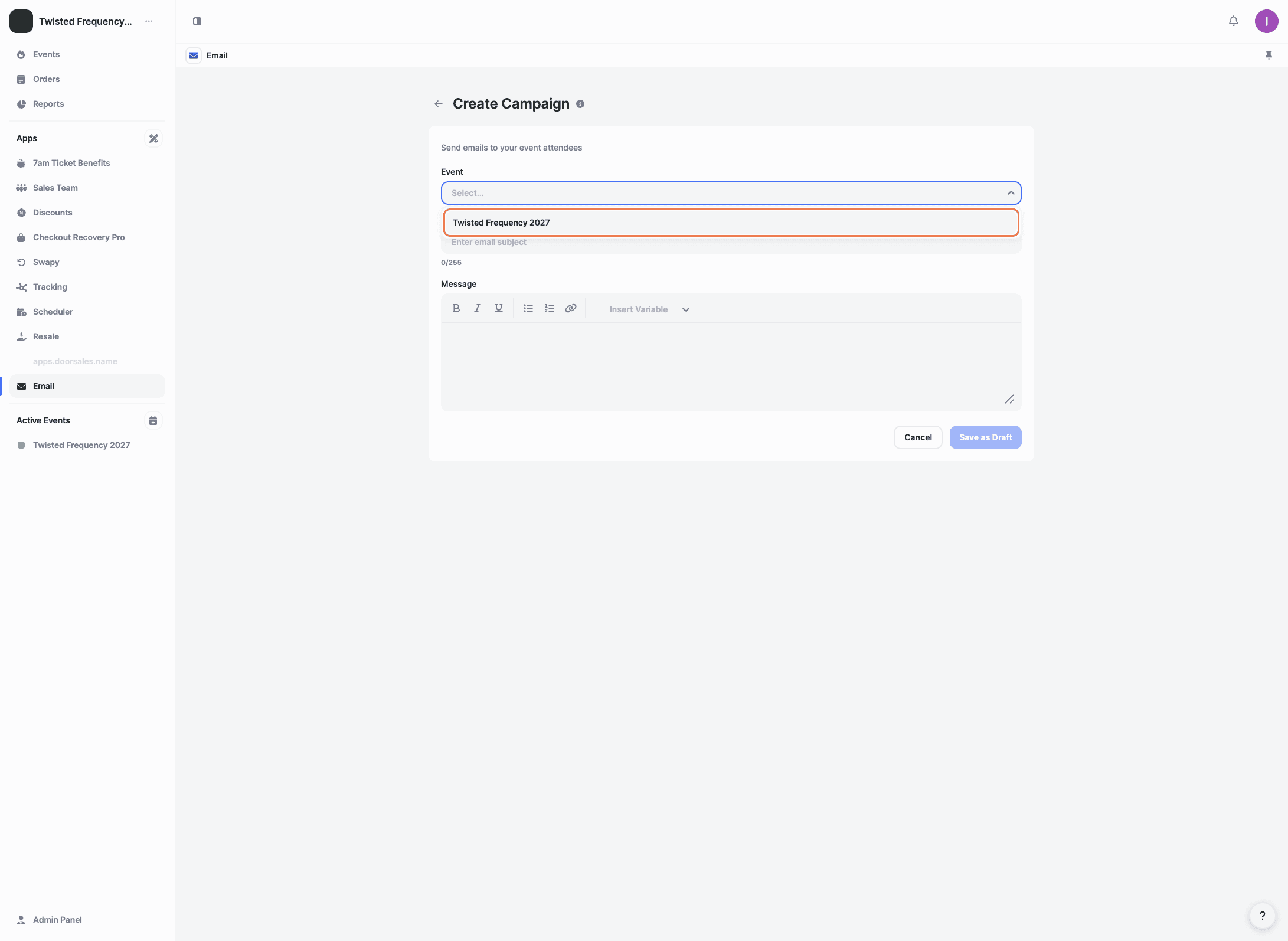 Choose the event you want to send the email campaign for. Only customers who purchased tickets for this event will receive the email.