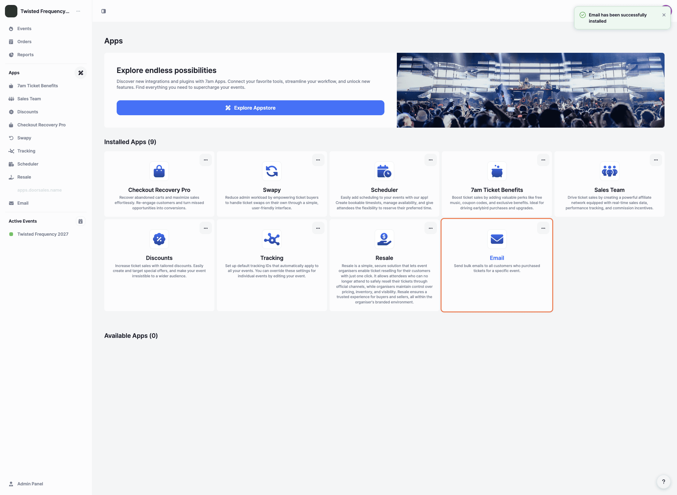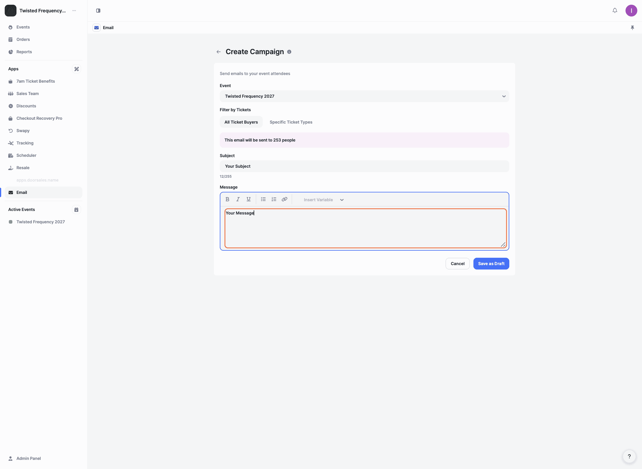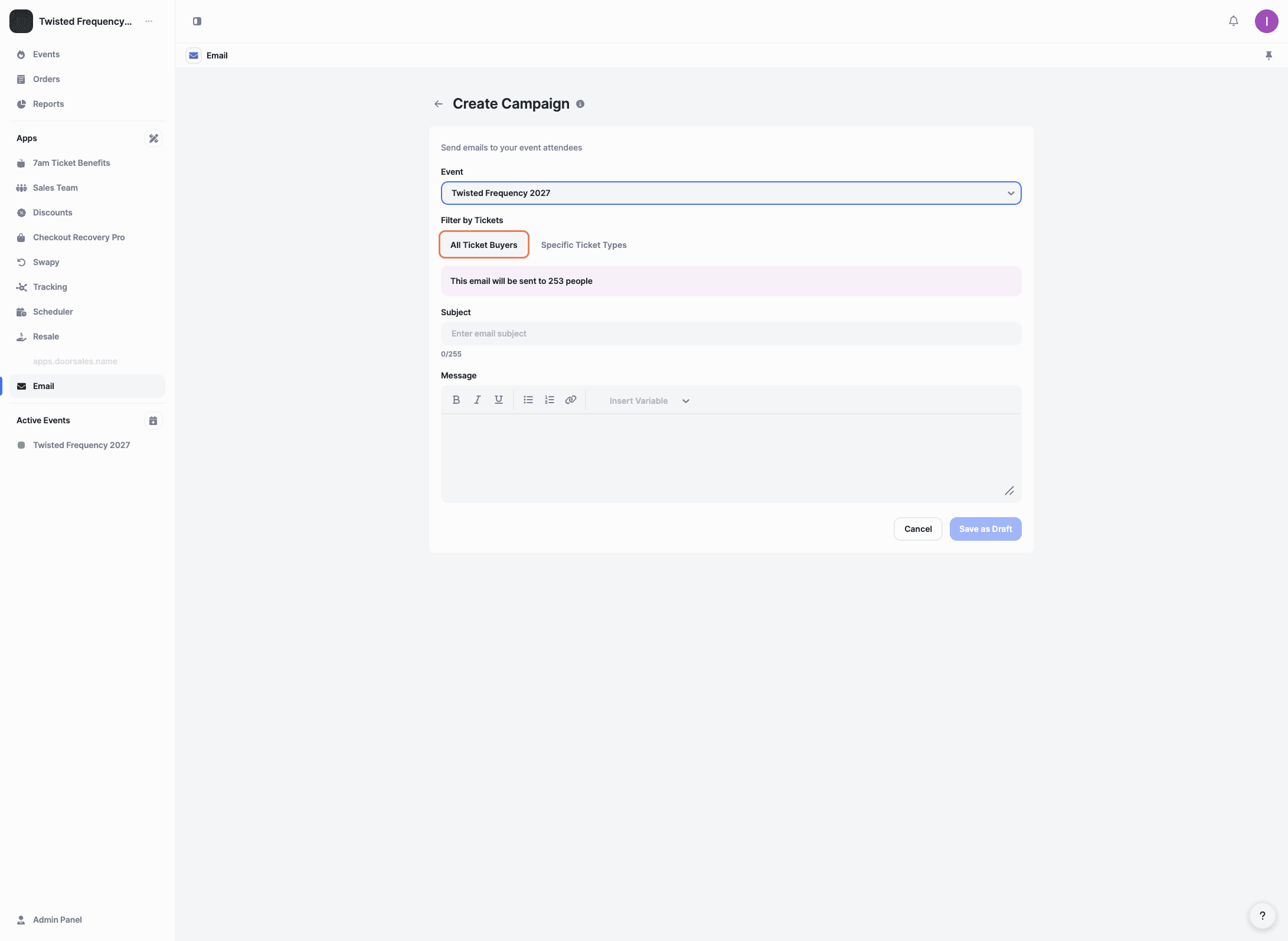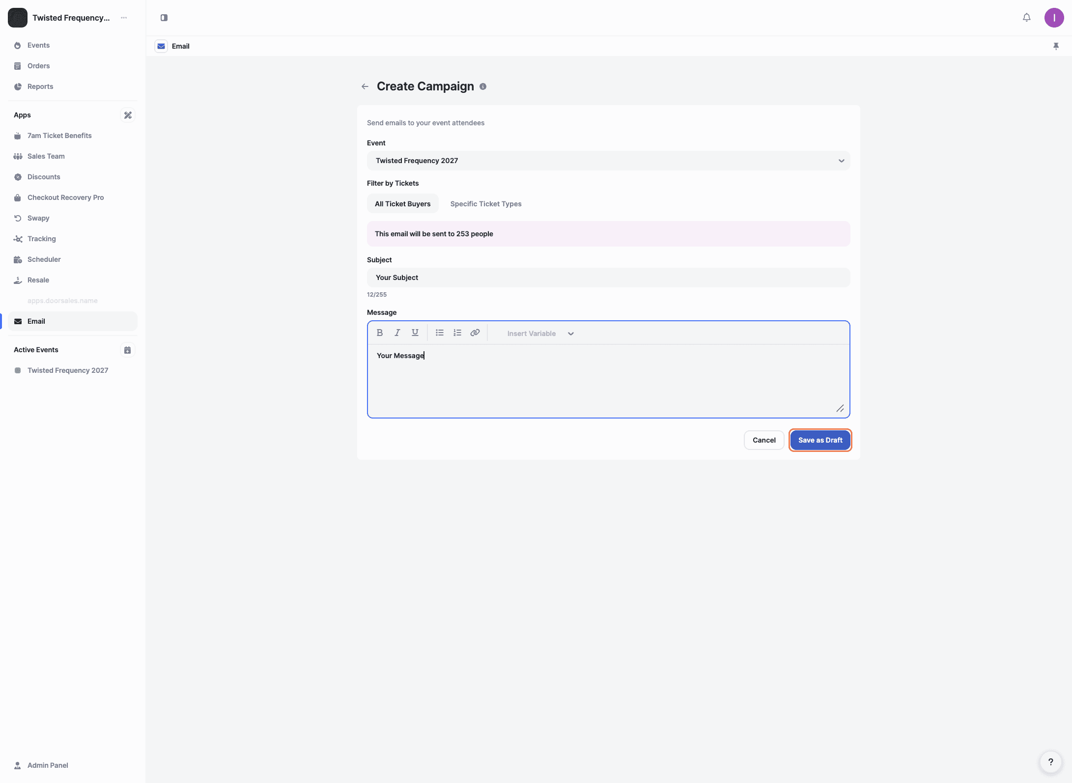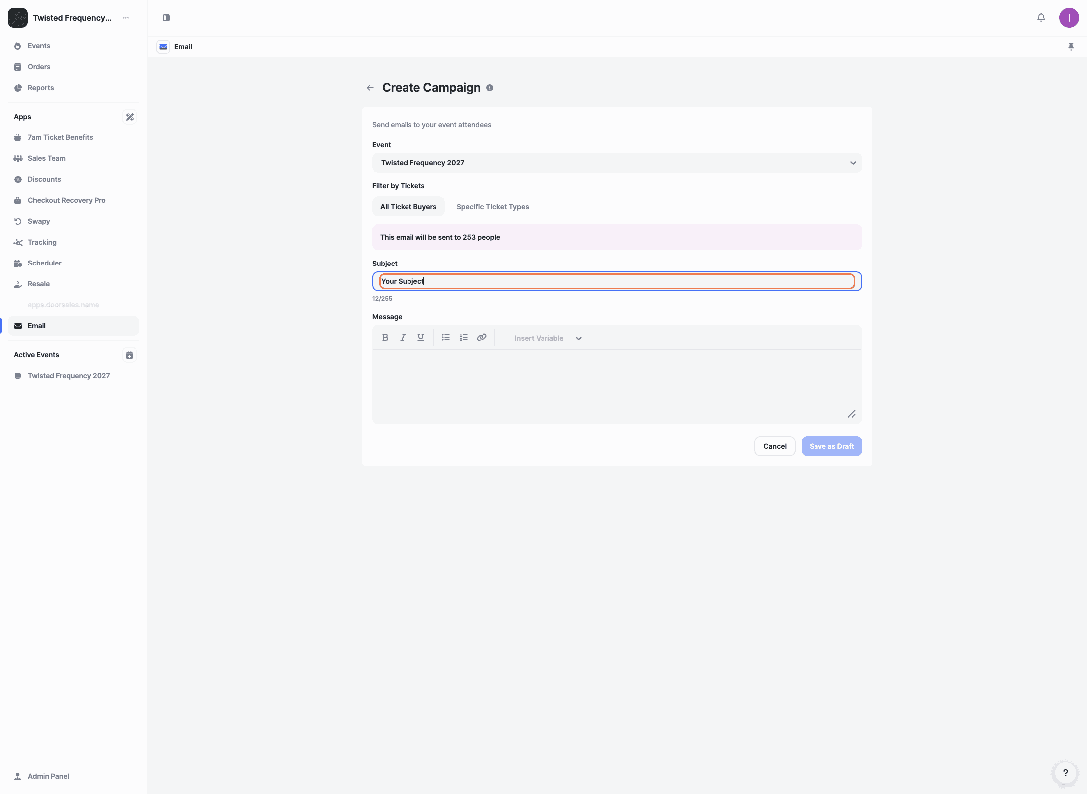 The Email app lets you send bulk emails to customers who have purchased tickets for a specific event. It’s ideal for sharing updates, reminders, or important event information directly from your panel.