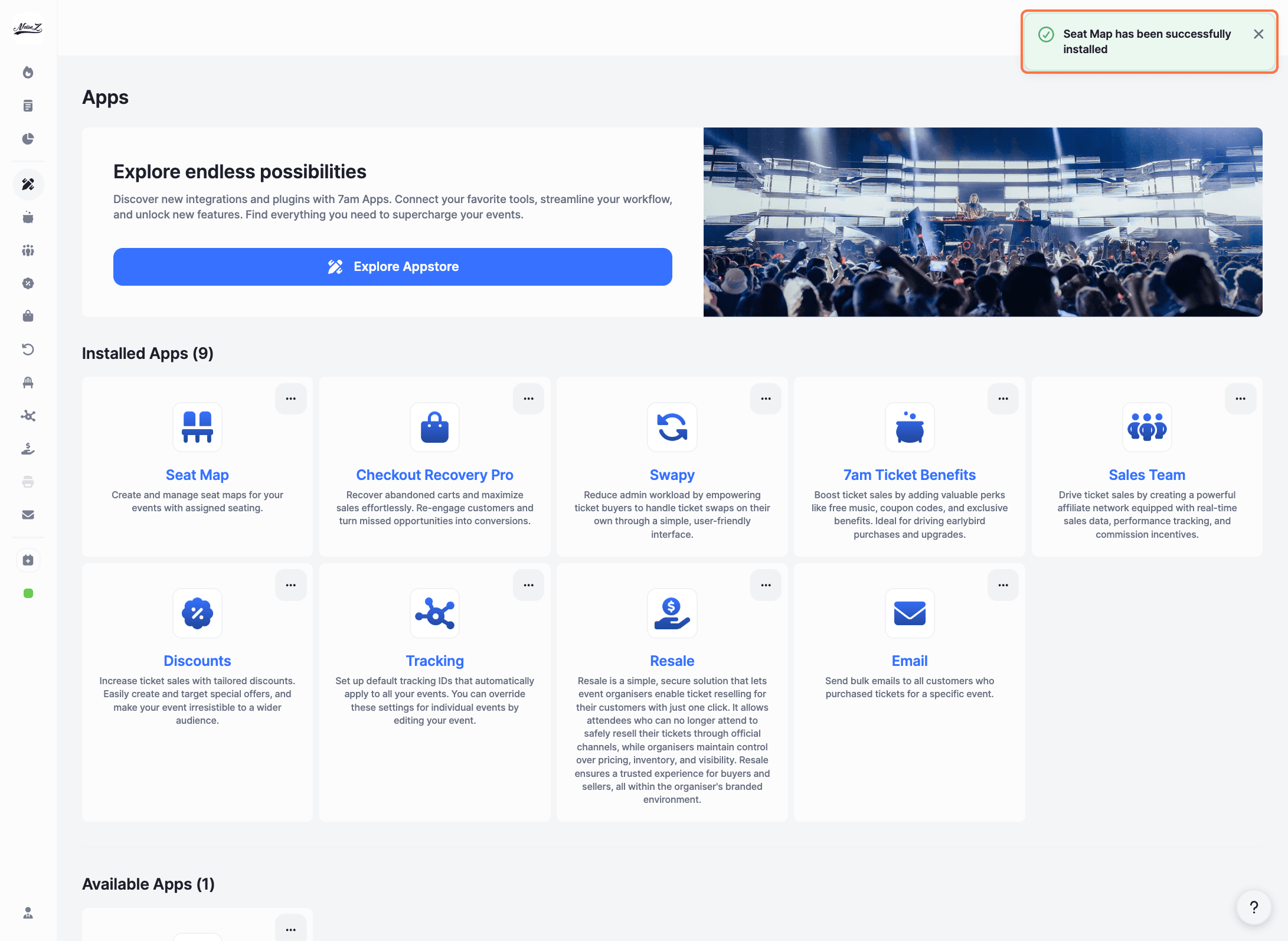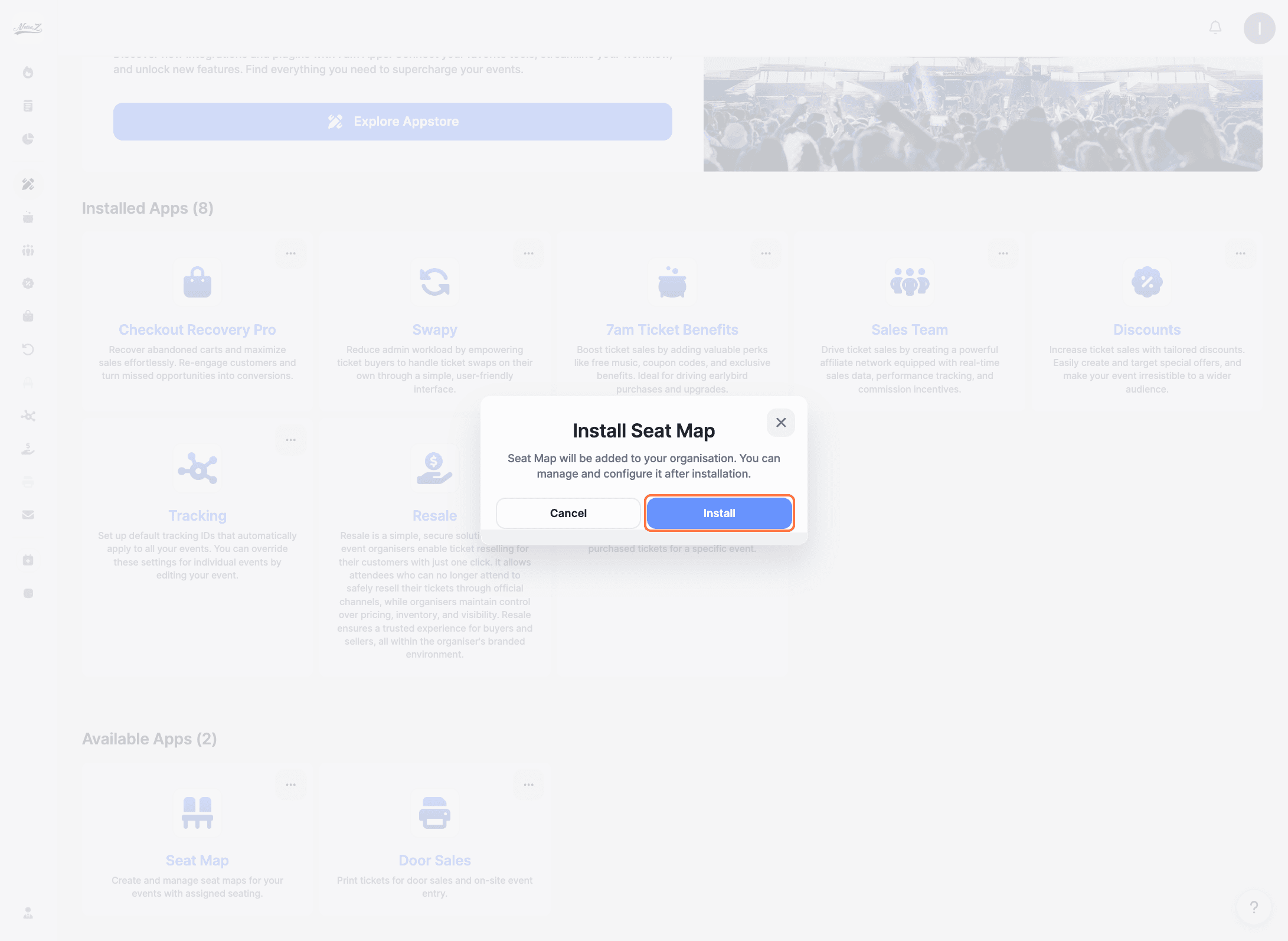 You'll see a success message: 'Seat Map has been successfully installed'. The app will now appear under 'Installed Apps'.