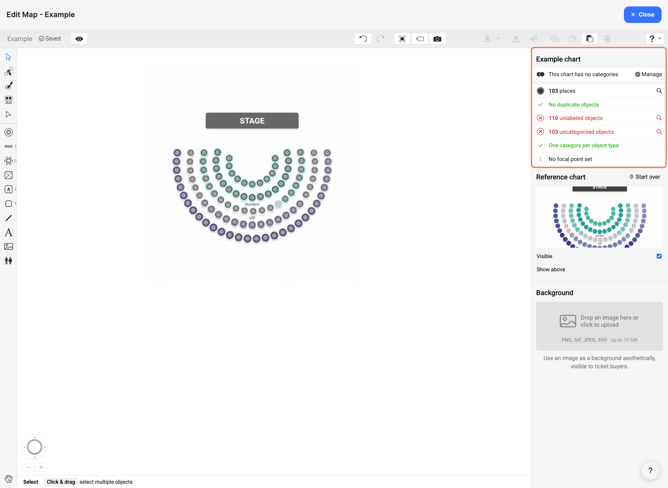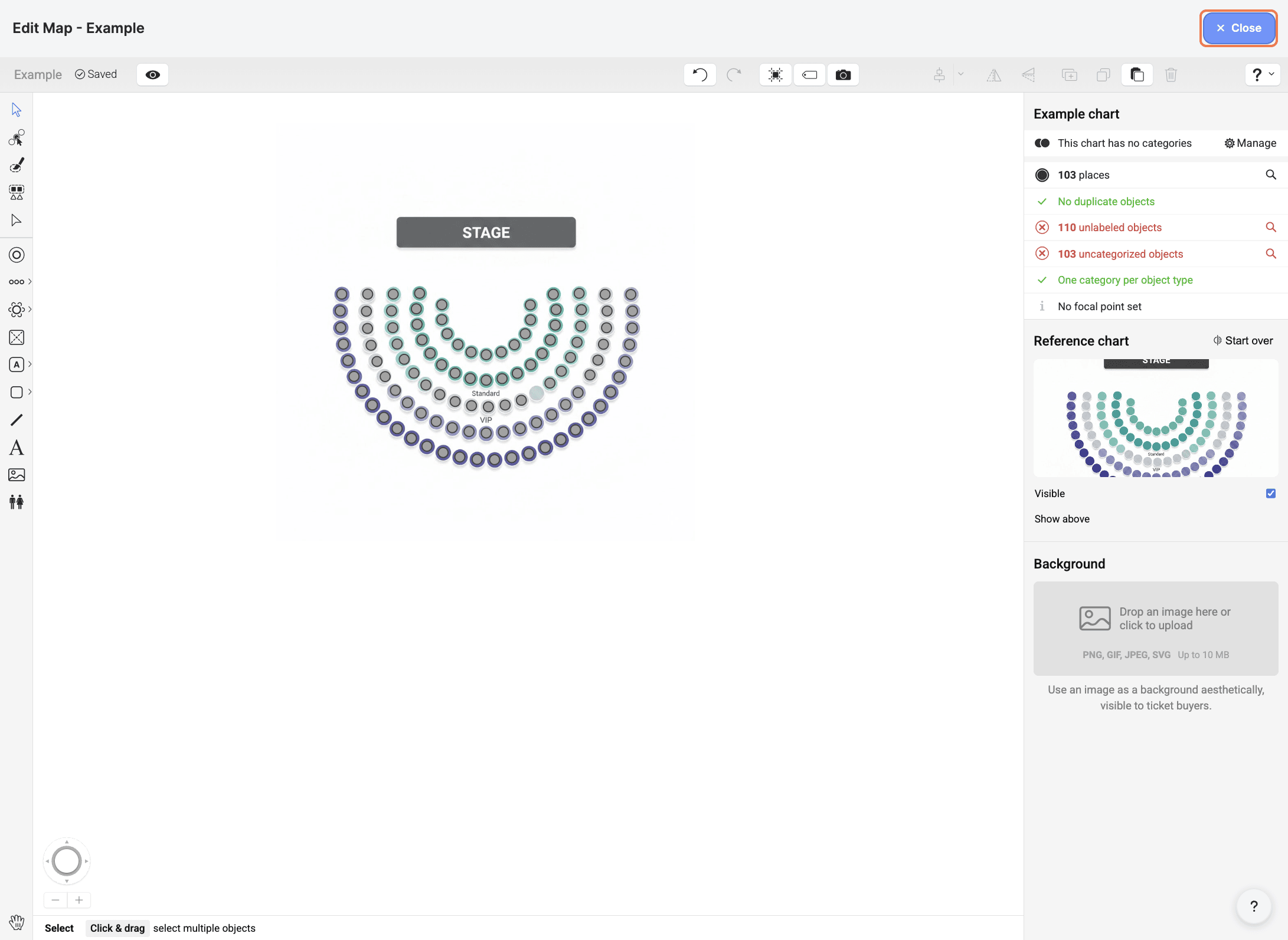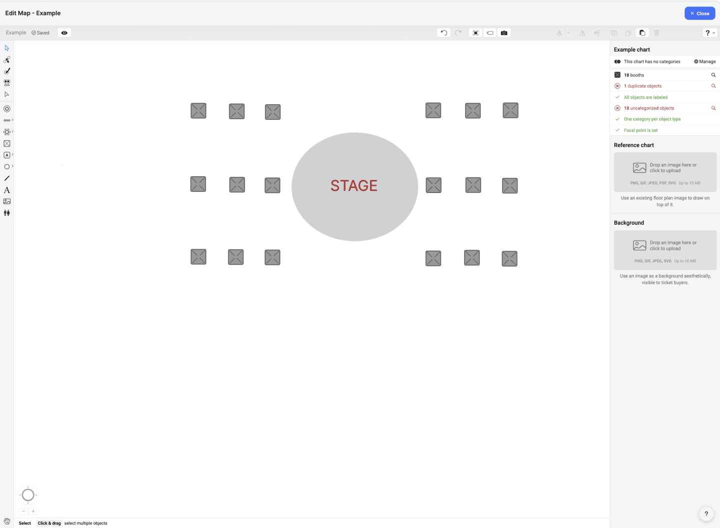 Both options work. If you have an existing floor plan, uploading it as a reference chart speeds up the process. If not, you can use the drawing tools to create your venue layout from scratch.