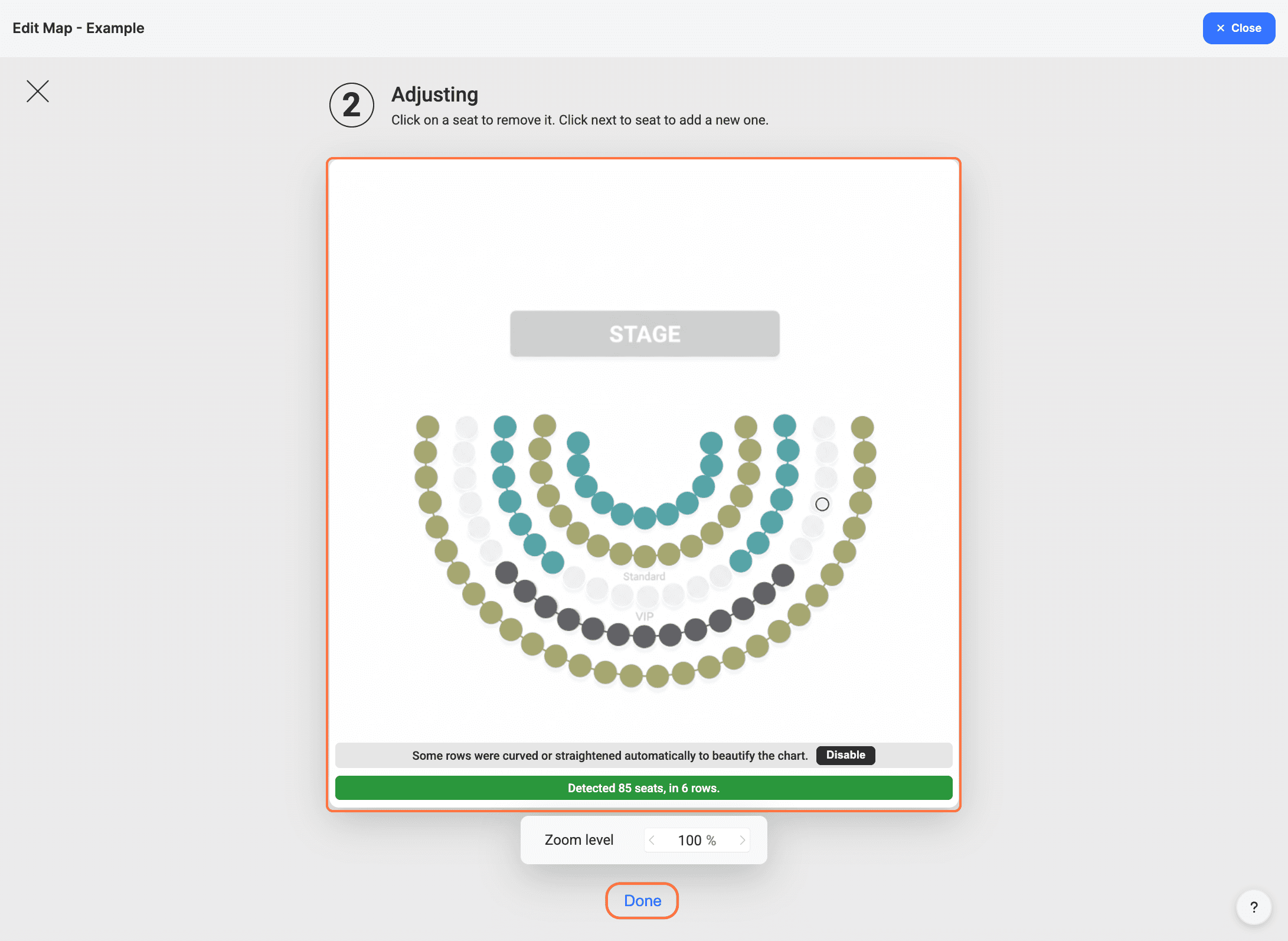 Zoom in and select seats on your uploaded image. The system will detect rows and seat counts. Click ‘Done’ once you have finished.