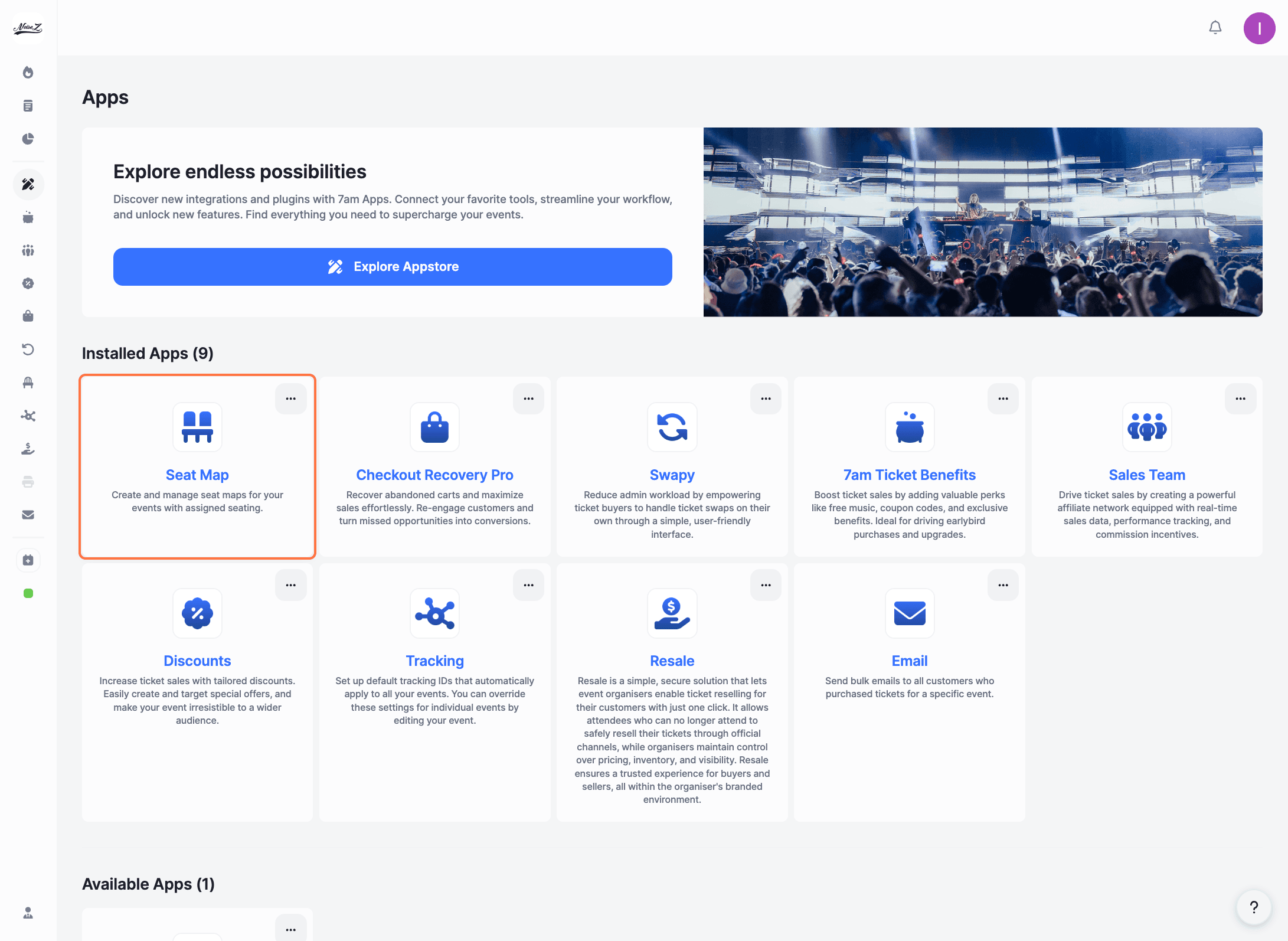 Under 'Available Apps', find 'Seat Map'. Click the three dots in the top-right corner of the app card.