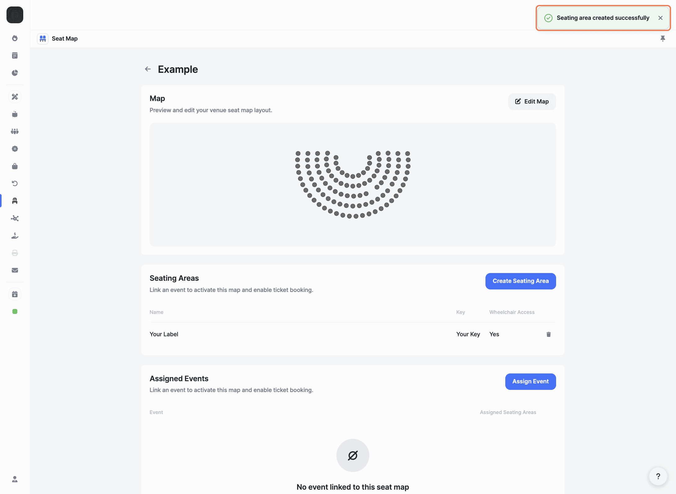 You'll see a confirmation message: 'Seating area has been created successfully'. Once created, you can assign tickets to this seating area.